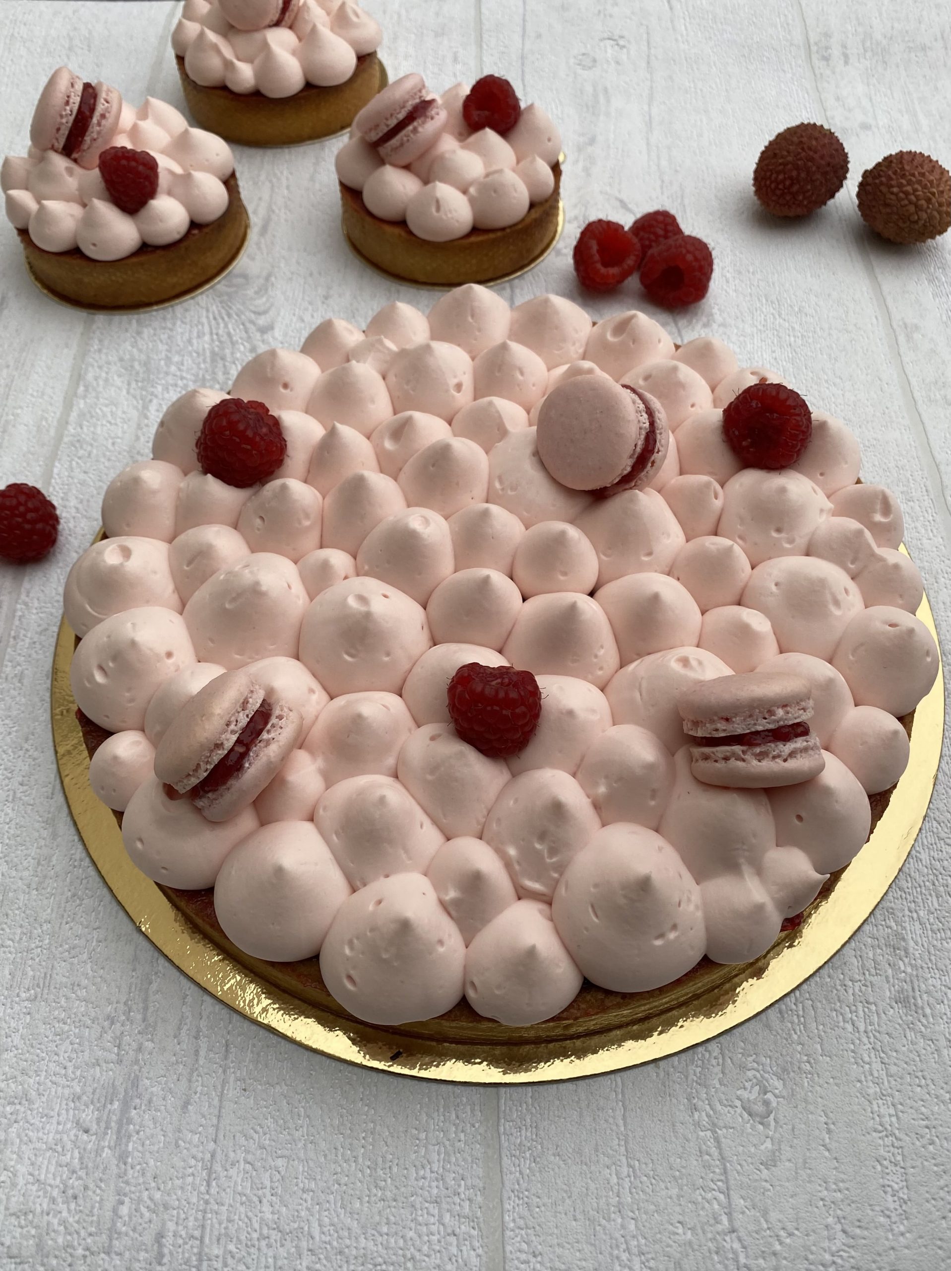 Pâte sablée, crème d’amande avec morceaux de litchi, confit de framboise, compotée de litchi, ganache montée à la rose, framboises fraîches et macarons framboise