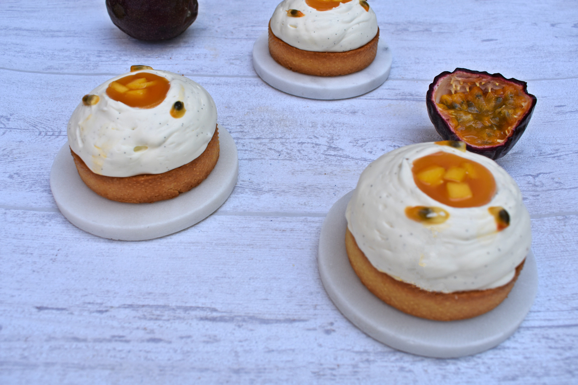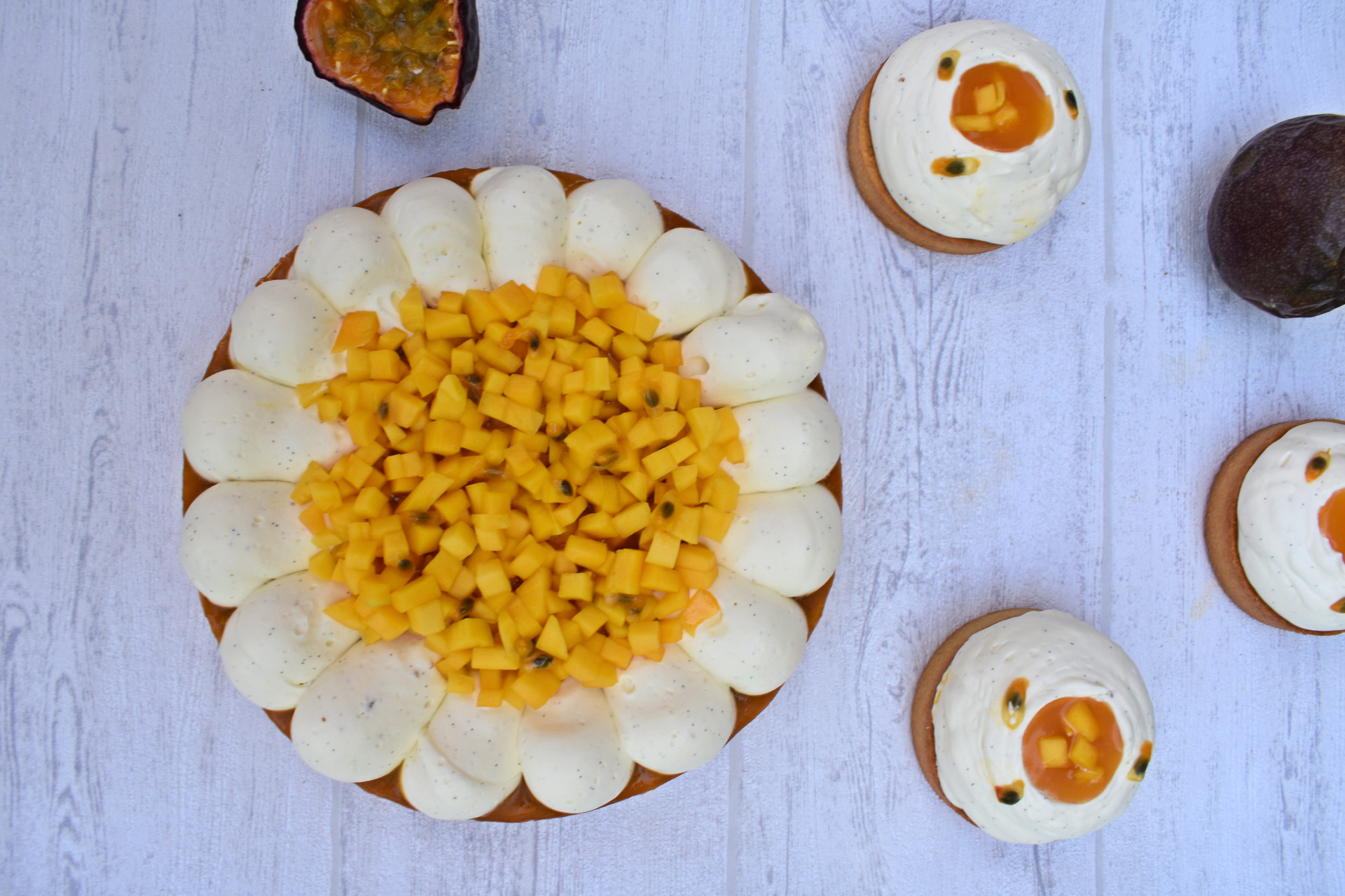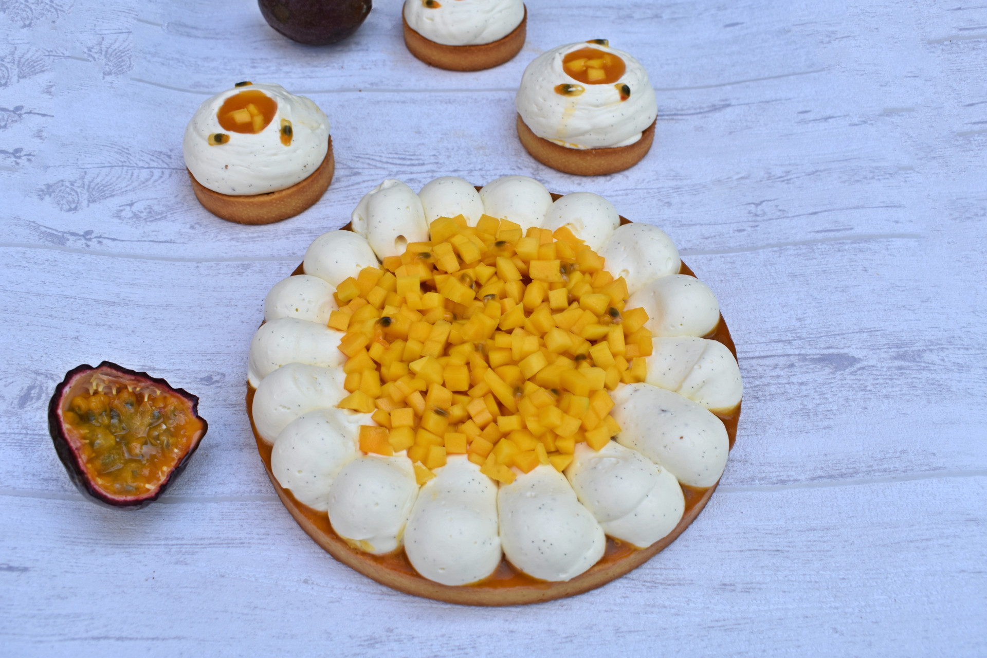 Une tarte lumineuse et fruitée, aux accents tropicaux, qui marie la mangue et le fruit de la passion à la douceur de la vanille.