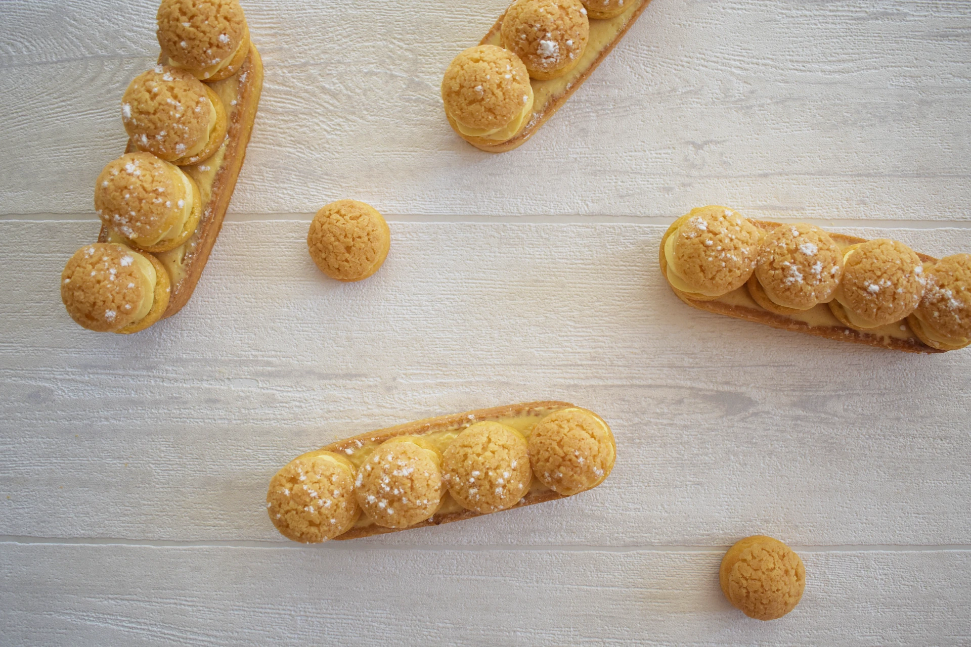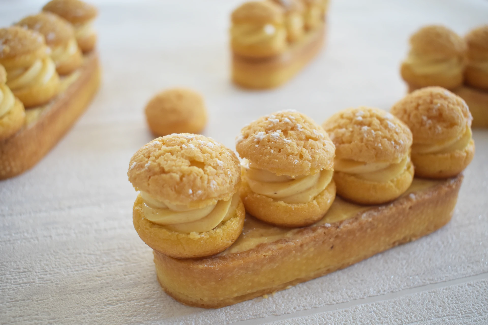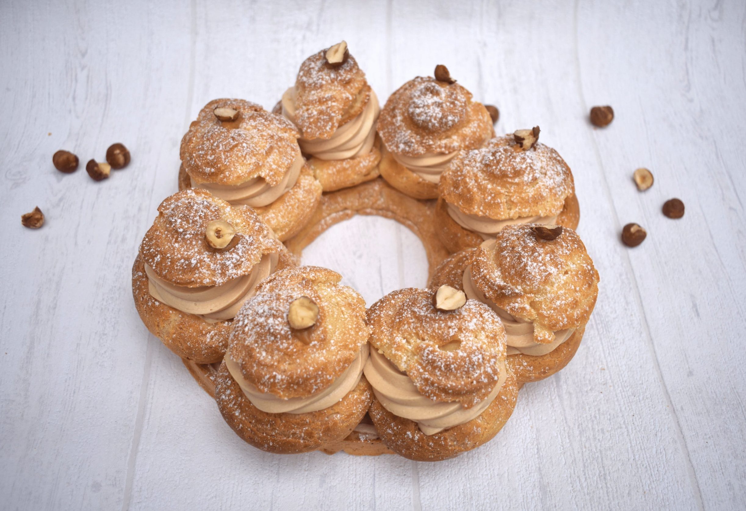 Elle est composée d'une pâte sucrée au praliné, d'un croustillant praliné, d'une crème mousseline pralinée et de choux craquelin garnis de crème mousseline pralinée