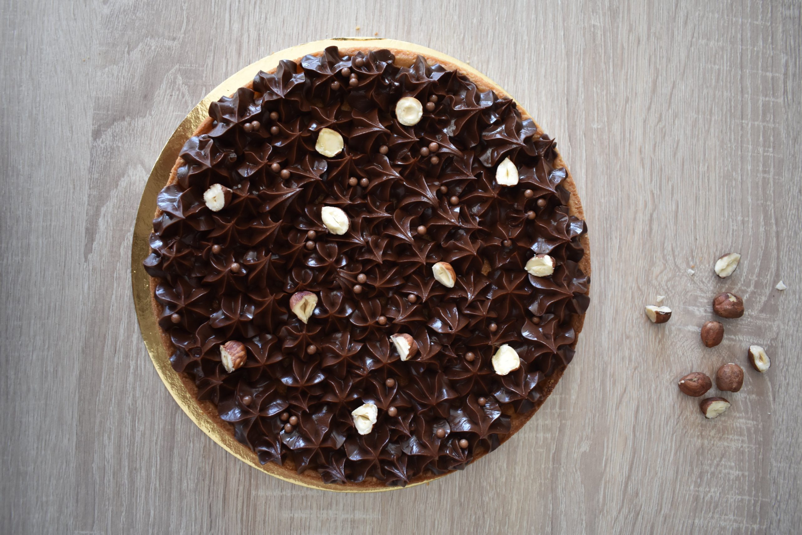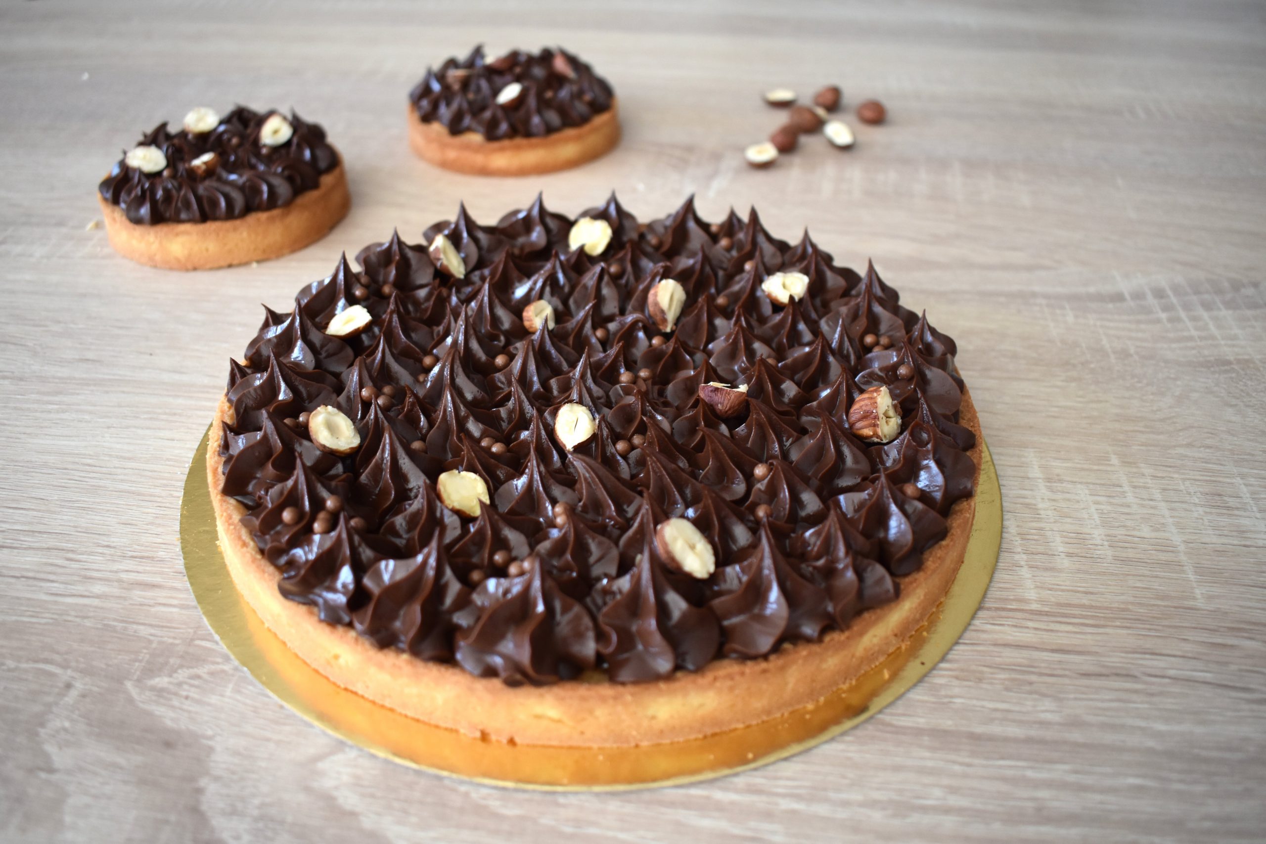 Pâte sucrée à la noisette, crème de noisette au gianduja, ganache au chocolat noir 70%, praliné noisette maison, et ses noisettes caramélisées.