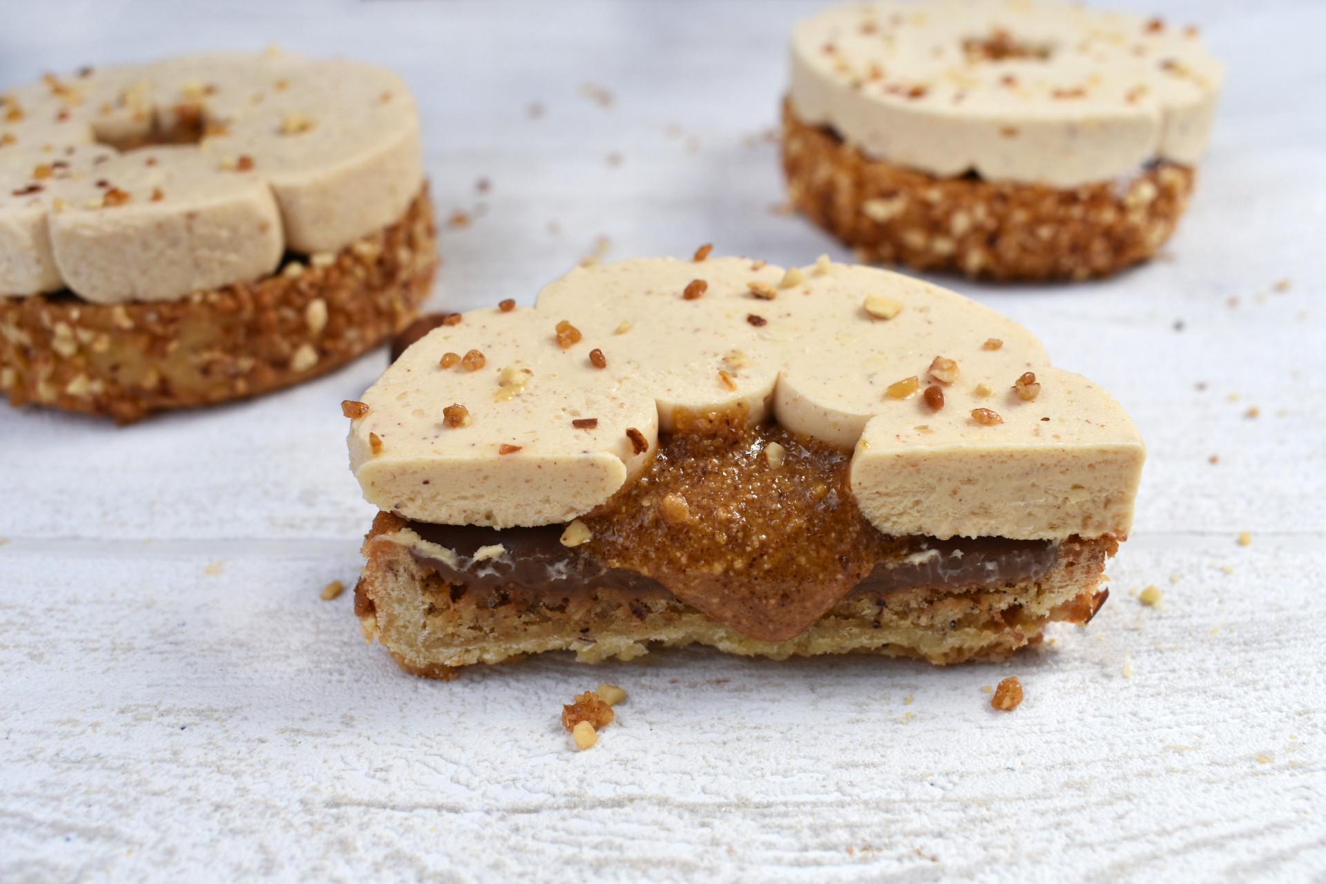Pâte sablée noisette, crème de noisette, ganache gianduja, ganache montée à la noisette et éclats de pralin, en touche croquante et parfumée.