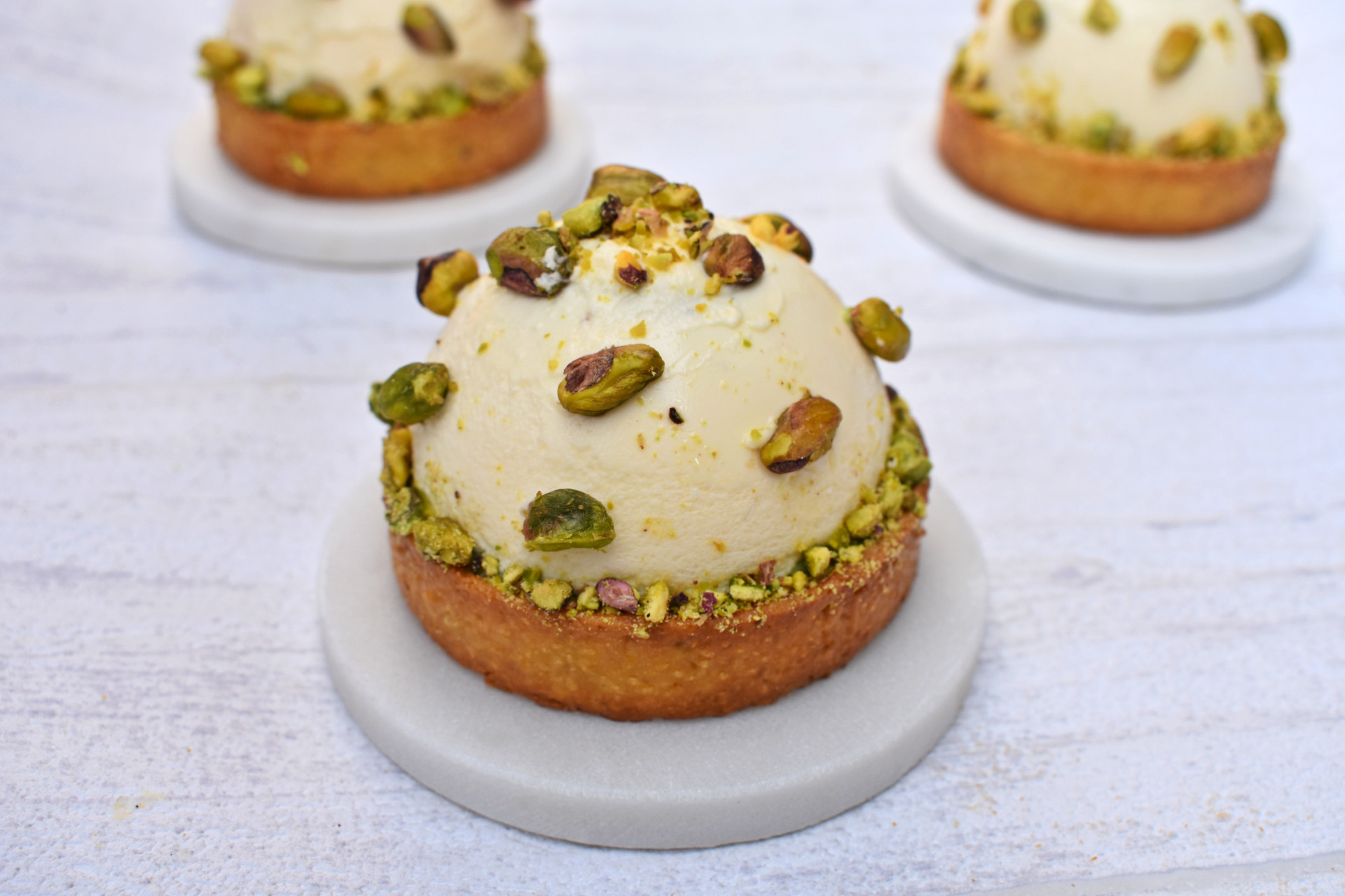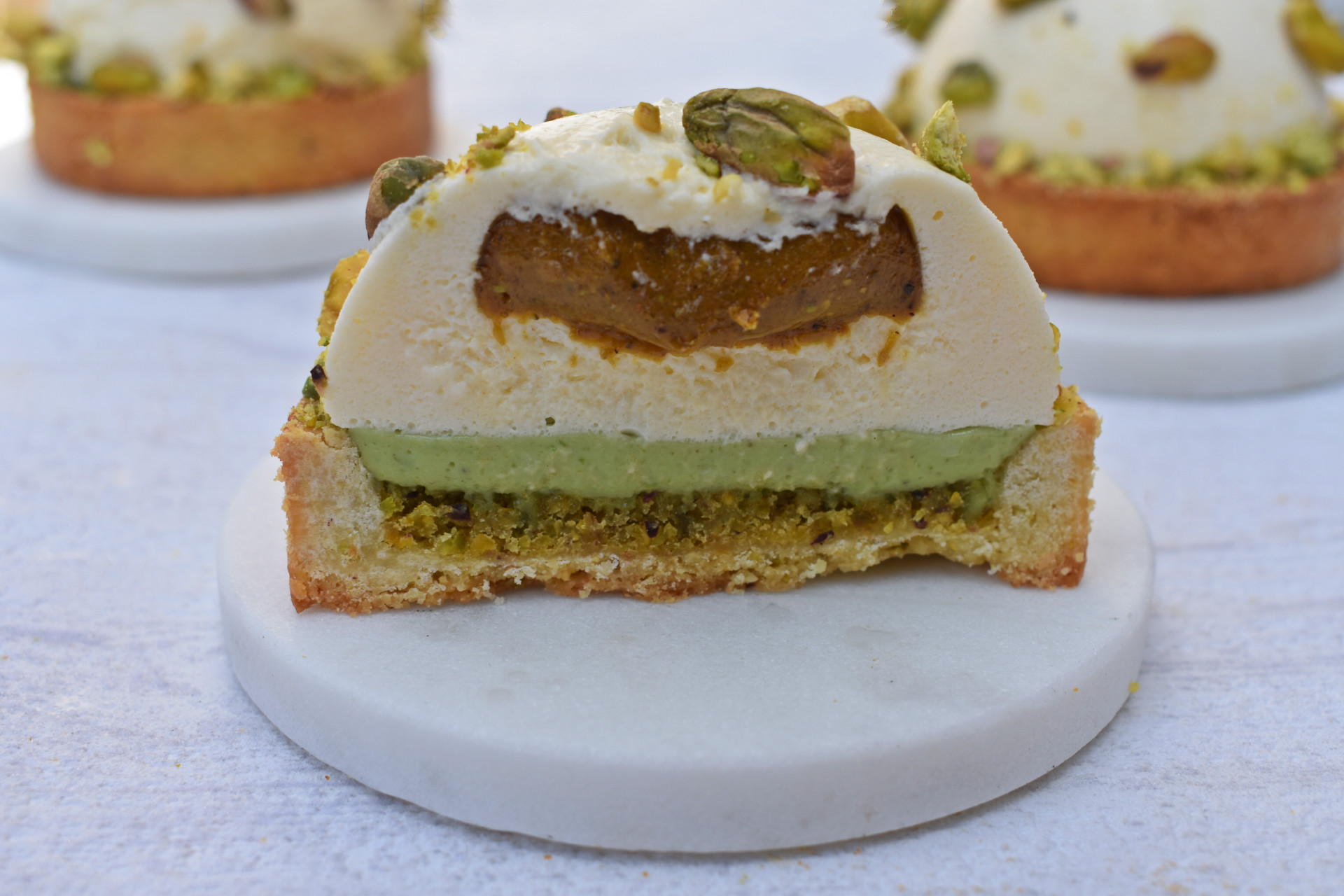 Pâte sablée marbré pistache, crème de pistache, crémeux pistache, insert praliné pistache, mousse fleur d’oranger, chantilly et ses quelques pistaches.